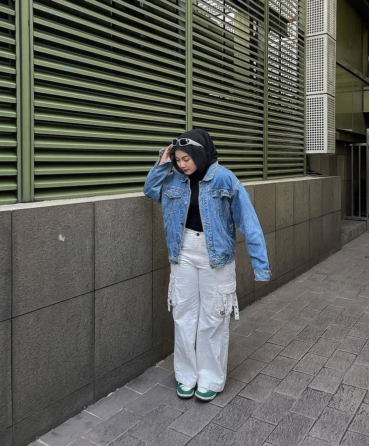 Alasan kenapa mix and match wide-leg cargo pants warna putih dan jaket denim sangat cocok karena warna kontras keduanya bikin tampilan kamu terlihat fresh dan standout. Jaket denim menambah kesan santai, keren, dan sedikit edgy, apalagi kalau dipakai agak loose supaya look-nya lebih effortless. Hijab hitam juga pas banget karena bikin keseluruhan outfit terlihat lebih balance, simpel, dan mudah menyatu dengan warna lain.