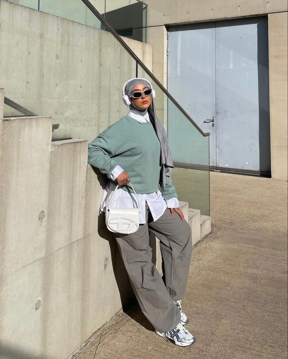 Stylish banget kalau kamu pakai baggy cargo pants dengan sweater hijau sage, kemudian dipadukan dengan white collared shirt, karena hasilnya bakal kelihatan keren, clean, dan punya sentuhan smart casual yang santai. Tampilan ini nggak terlalu formal tapi tetap terlihat modis dan kekinian banget. Ya bisa dibilang, perpaduannya pas banget kalau kamu mau look yang agak boyish, tapi tetap chic buat ngampus, nongkrong, atau jalan santai.