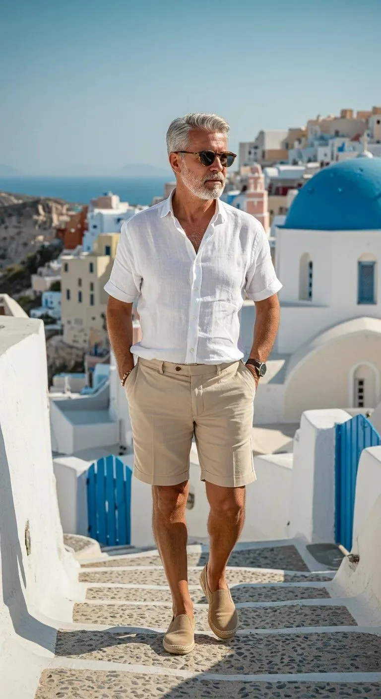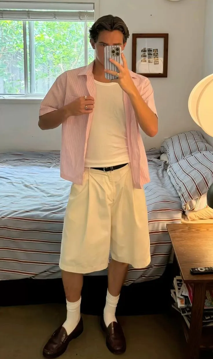 Kamu bisa padukan dengan kemeja linen atau kemeja lengan pendek slim fit. Ini salah satu outfit pria celana pendek yang cocok buat dinner santai, acara semi-formal outdoor, atau liburan yang tetap pengin tampil proper.